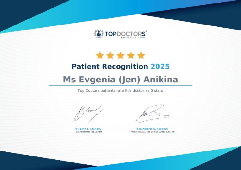 Ms Evgenia Anikina is a highly experienced retinal specialist, having trained in Cambridge and London and undertaken two surgical retinal fellowships and a medical retina fellowship at Moorfields Eye Hospital prior to being appointed as a Consultant Vitreoretinal Surgeon at the Royal Berkshire NHS Trust.